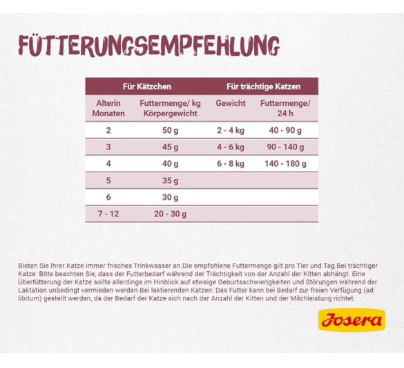 جوسرا کیتن سوپرپرمیوم، غذایی کامل و متعادل، سرشار از پروتئین مرغ باکیفیت، اسیدهای چرب امگا ۳ و ۶، و فاقد گلوتن، برای تامین تمام نیازهای بچه گربه و گربه مادر در دوران بارداری و پس از آن در روز های شیردهی در دوران حیاتی رشد فرموله شده است. این غذای خوشمزه و به راحتی قابل هضم، ضامن سلامت پوست و موی براق، رشد کامل و شادابی گربه شما خواهد بود. جوسرا کیتن، انتخابی ایدهآل برای گربههای در حال رشد، مادران باردار و شیرده، و تمام گربههایی است که به دنبال تغذیهای باکیفیت و مغذی هستند.