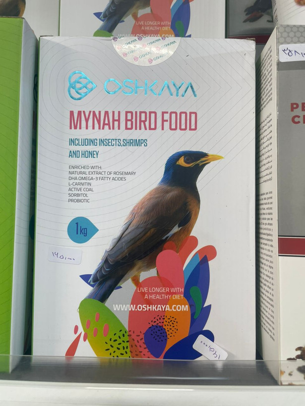 غذای خشک مرغ مینا اوشکایا مدل Food Special ویژه مرغ مینا و دیگر پرندگان حشره خوار فرموله و تولید شده است که با توجه به نیازهای روزمره این پرنده بالانس و تولید گردیده است. این محصول حاوی حشرات، میگو و عسل می باشد و با ویتامین ها، اسیدهای آمینه مواد معدنی، عناصر کمیاب DHA، ال کارنتین، زغال فعال و عصاره گیاهی رزماری غنی شده است.