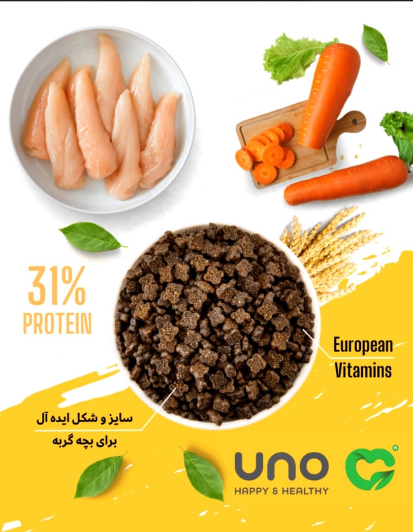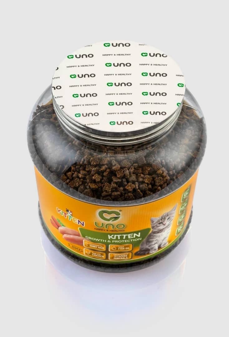 غذای سوپر پریمیوم گربه کیتن اونو UNO یک غذای بسیار خوش خوراک با 31% پروتئین خالص آزمایش شده است. کلیه محصولات اونو حاوی سری کامل ویتامین ها و مواد معدنی تامین شده از BASF آلمان، DSM هلند و Adisseo فرانسه میباشند. این غذا کلیه ویتامین ها و مواد معدنی مورد نیاز گربه شما را تامین میکند و نیازی به مکمل اضافی ندارید