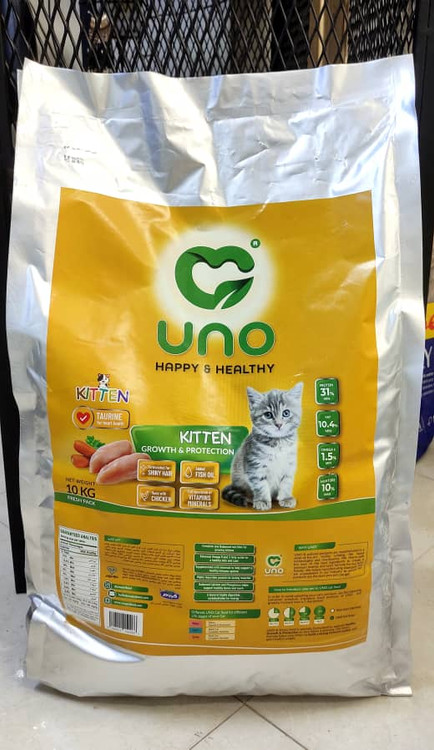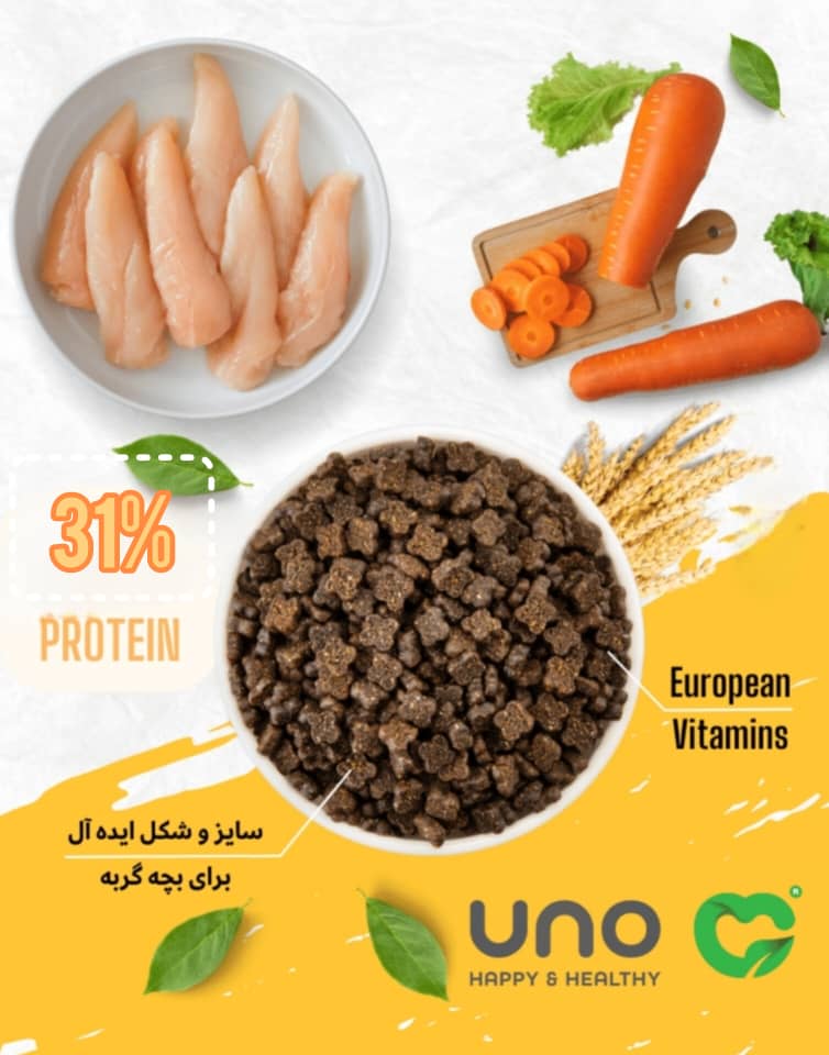 غذای سوپر پریمیوم بچه گربه ( کیتن ) اونو UNO یک غذای بسیار خوش خوراک با 31% پروتئین خالص آزمایش شده است. کلیه محصولات اونو حاوی سری کامل ویتامین ها و مواد معدنی تامین شده از BASF آلمان، DSM هلند و Adisseo فرانسه میباشند. این غذا کلیه ویتامین ها و مواد معدنی مورد نیاز گربه شما را تامین میکند و نیازی به مکمل اضافی ندارید.